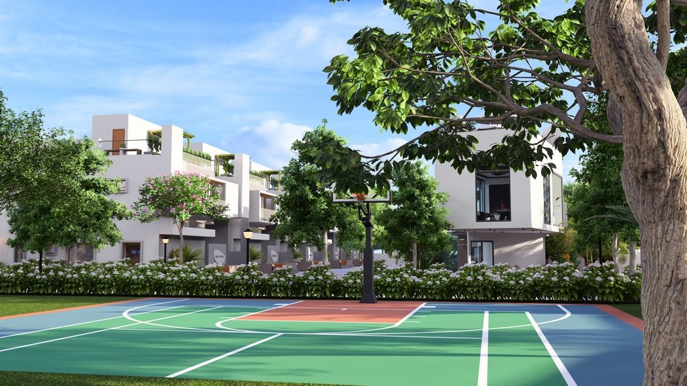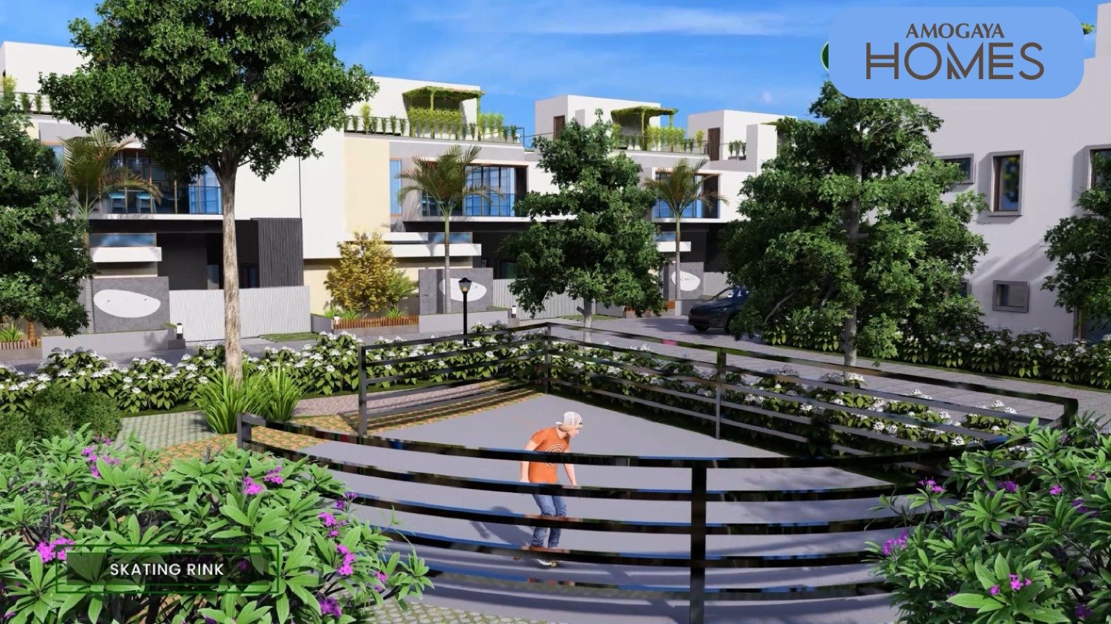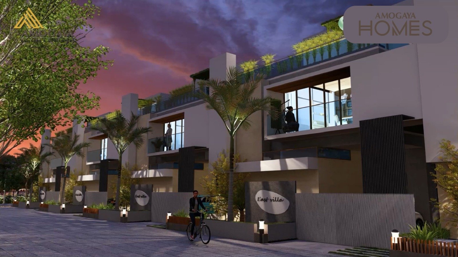 AMOGAYA HOMES Villas are designed with unique elevations and with unique Duplex and optional Triplex plans that have spacious bedrooms, living area, kitchen, toilets, wide balconies, and open terrace sit-outs.